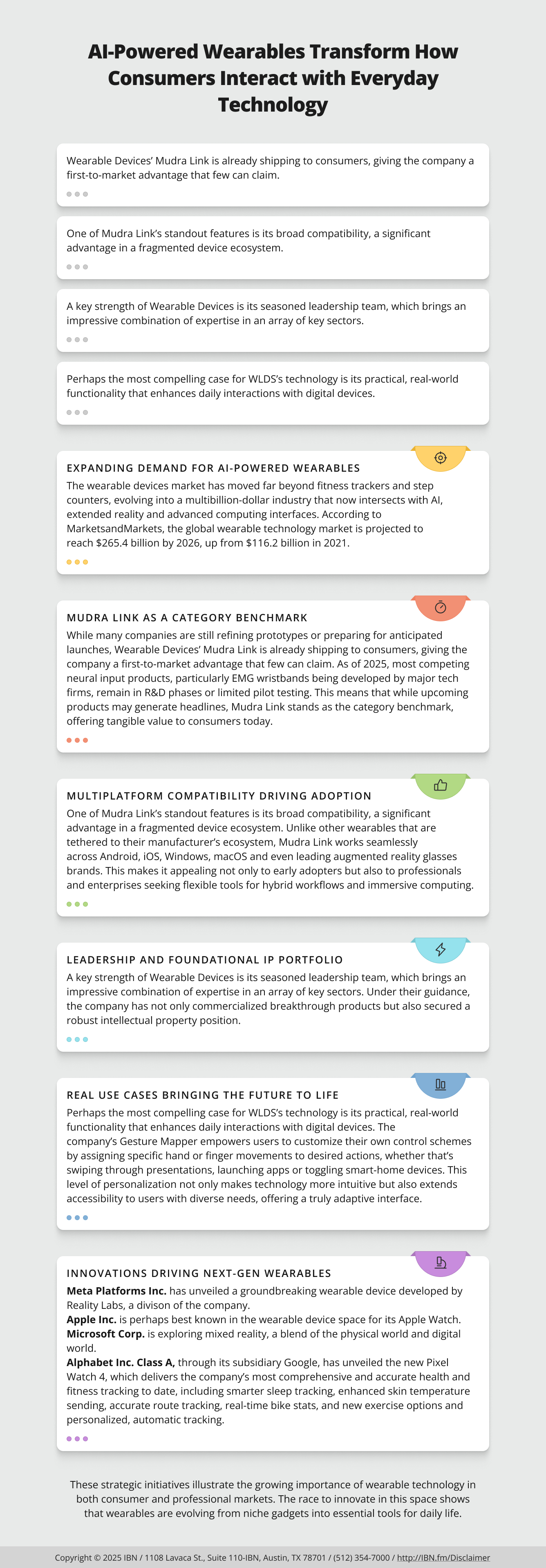 NetworkNewsWire Editorial Coverage: The global demand for AI-driven, touchless wearable technologies is accelerating as consumers seek more natural, seamless and intuitive ways to interact with their devices. Traditional touch screens and voice assistants, while effective, are increasingly viewed as limiting in a world where multitasking, mobility and efficiency are key. As industries from consumer electronics to augmented reality and enterprise computing embrace the possibilities of gesture-based control, the market for neural interfaces is rapidly expanding. Wearable Devices Ltd. (NASDAQ: WLDS) (Profile) has positioned itself at the forefront of this transformation, pioneering AI-powered, touchless sensing wearables. With its breakthrough neural input technology, the company has already introduced two flagship products to consumers: the Mudra Band, a smart band for the Apple Watch that delivers intuitive device control, and the Mudra Link, a versatile platform designed for cross-ecosystem users seeking a frictionless, gesture-based input solution. Wearable Devices is part of an impressive group of companies — including Meta Platforms Inc. (NASDAQ: META), Apple Inc. (NASDAQ: AAPL), Microsoft Corp. (NASDAQ: MSFT) and Alphabet Inc. Class A (NASDAQ: GOOGL) — that are making strategic moves in the wearable device space.