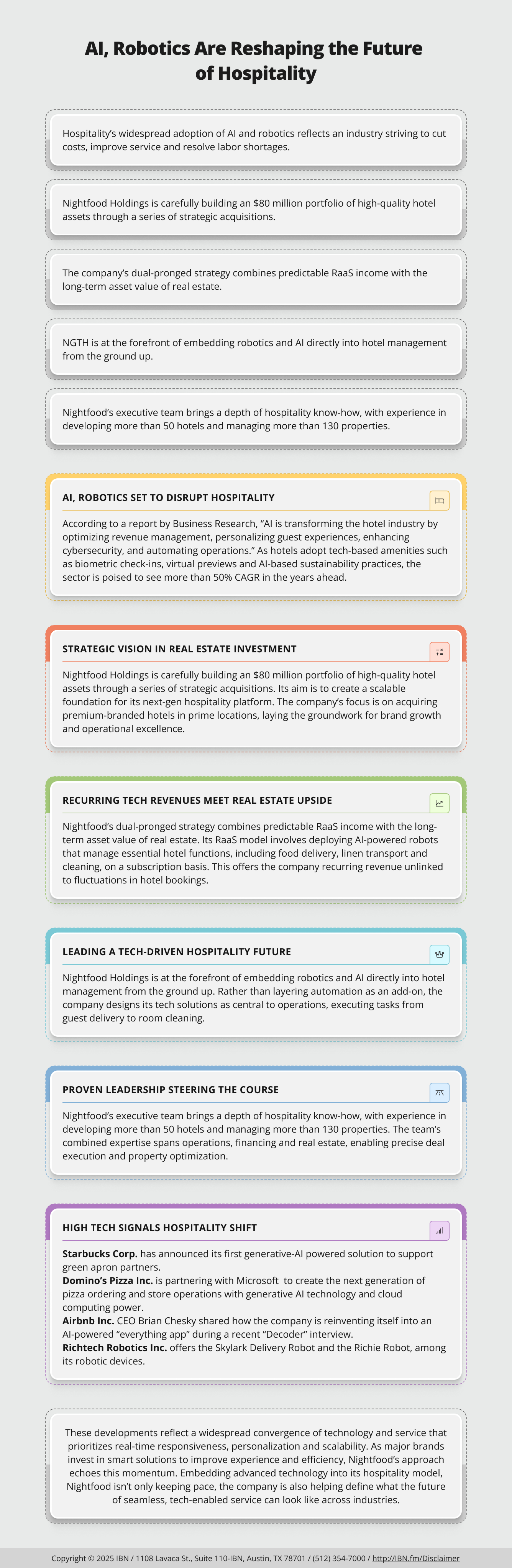 NetworkNewsWire Editorial Coverage: The hospitality industry is rapidly evolving as artificial intelligence (“AI”) and robotics bring sweeping change. Hotels that implement automation are seeing operational costs drop by 30%–40%, along with enhanced guest satisfaction and stronger revenue strategies. The AI-driven hospitality market is projected to surge to $1.46 billion by 2029 with an impressive 57.8% compound annual growth rate (“CAGR”), while the broader hospitality robotics sector is anticipated to expand from $24.38 billion in 2024 to $107.24 billion by 2034. At the forefront of this transformation is Nightfood Holdings Inc. (NGTF) (Profile), an innovator in hospitality that fuses hotel ownership with a Robotics-as-a-Service (“RaaS”) business model powered by AI. The company recently disclosed plans to purchase a 155-room Holiday Inn in Victorville, California, marking its debut model property featuring guest-facing robots such as food runners and laundry assistants, developed by NGTF subsidiary Skytech Automated Solutions. Nightfood also partnered with Bear Robotics to roll out these automation solutions across its entire hotel portfolio, which is expected to grow to $80 million in assets. This positions Nightfood alongside other leaders in the hospitality, food and robotics space, including Starbucks Corp. (NASDAQ: SBUX), Domino’s Pizza Inc. (NASDAQ: DPZ), Airbnb Inc. (NASDAQ: ABNB) and Richtech Robotics Inc. (NASDAQ: RR).