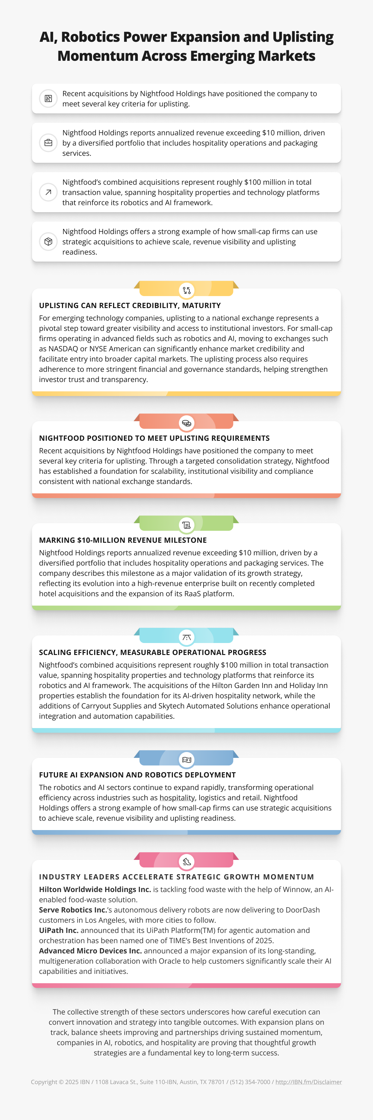 NetworkNewsWire Editorial Coverage: The convergence of artificial intelligence (AI) and robotics is reshaping global industries, from logistics and manufacturing to hospitality and hotel management. As demand for automation rises, small-cap companies are accelerating growth through targeted acquisitions designed to boost revenue, expand capabilities and strengthen competitive positioning. These efforts are helping emerging players transition from over-the-counter (“OTC”) markets to national exchanges, where greater visibility and institutional access can fuel their next stage of growth. Uplisting represents more than a status change; it’s a pathway to scale AI and robotics solutions faster and more effectively. Nightfood Holdings Inc. (NGTF) (Profile), doing business as TechForce Robotics, reflects this strategy. Through a series of acquisitions, the company has developed a portfolio that merges revenue-generating assets with AI-driven robotic technology operating in the hospitality space. With annualized revenue exceeding $10 million and an estimated combined acquisition value of roughly $100 million, Nightfood is advancing toward exchange readiness as it works to position itself among robotics, AI and hospitality leaders, including Hilton Worldwide Holdings Inc. (NYSE: HLT), Serve Robotics Inc. (NASDAQ: SERV), UiPath Inc. (NYSE: PATH) and Advanced Micro Devices Inc. (NASDAQ: AMD).