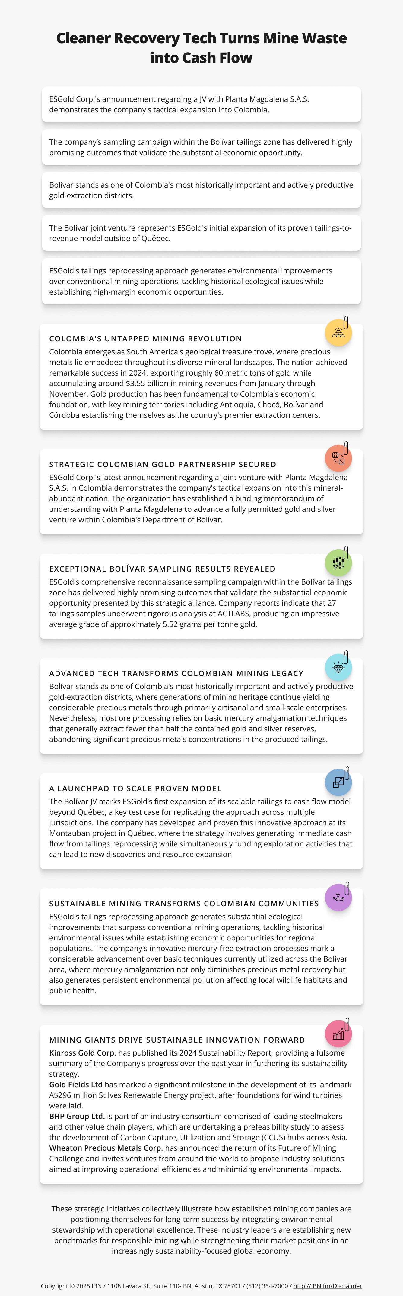 NetworkNewsWire Editorial Coverage: Across Colombia’s legendary gold-producing regions, generations of traditional mining operations have accumulated enormous volumes of tailings, material that earlier technologies deemed worthless but which actually harbors substantial reserves of precious metals. These historical deposits now present a dual opportunity to both remedy long-standing environmental concerns while also accessing previously unrecoverable gold and silver through cutting-edge extraction methods. ESGold Corp. (CSE: ESAU) (OTCQB: ESAUF) (Profile) is pioneering this innovative approach, where its recently unveiled, fully permitted joint venture in Bolívar demonstrates how next-generation processing capabilities can convert abandoned mining waste into profitable, sustainable operations. Through environmentally conscious practices, ESGold is simultaneously extracting valuable resources and transforming decades-old ecological burdens into engines of responsible economic development. ESGold joins a select group of mining companies — including Kinross Gold Corp. (NYSE: KGC), Gold Fields Ltd. (NYSE: GFI), BHP Group Ltd. (NYSE: BHP) and Wheaton Precious Metals Corp. (NYSE: WPM) that are focused on positioning themselves in the global mining space through the use of environmentally friendly, advanced technologies combined with careful strategy.