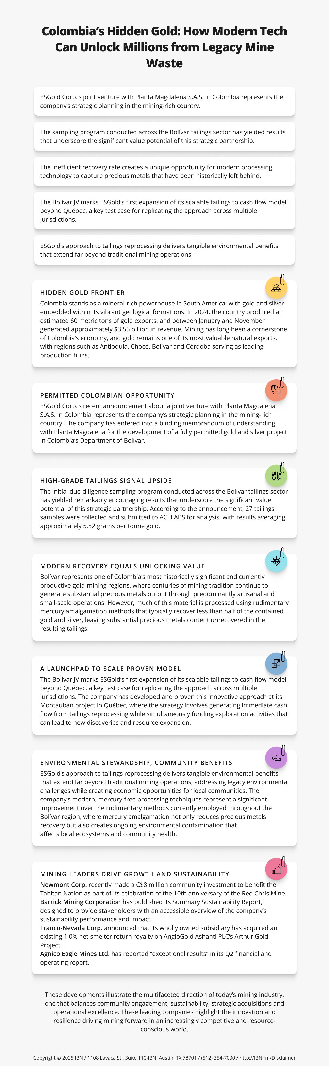 NetworkNewsWire Editorial Coverage: In one of South America’s most prolific gold belts, centuries of mining have left behind massive tailings piles, discarded material that, despite being overlooked for generations, still contains significant quantities of gold and silver. These legacy remnants represent both an environmental challenge and an untapped resource, as modern recovery techniques reveal just how much value remains locked within them. ESGold Corp. (CSE: ESAU) (OTCQB: ESAUF) (Profile) is at the forefront of addressing this opportunity in Colombia, where its newly announced, fully permitted joint venture in Bolívar highlights how advanced processing technology can transform mine waste into scalable, high-margin production. By mining responsibly, ESGold is not only unlocking hidden wealth but also turning environmental liabilities into sustainable growth. ESGold joins an impressive group of mineral miners — including Newmont Corp. (NYSE: NEM), Barrick Mining Corporation (NYSE: B), Franco-Nevada Corp. (NYSE: FNV) and Agnico Eagle Mines Ltd. (NYSE: AEM) — that are strengthening their positions in the global mining sector through strategic planning and the use of responsible, innovative technology.
