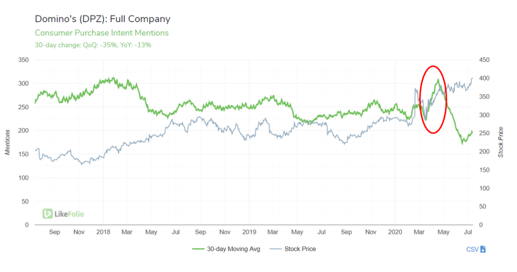 Domino’s Pizza (NYSE: DPZ) was featured in a recent analysis report that detailed the company’s surge in demand during the quarantine. The report, written by LikeFolio Founder Andy Swan, reads, “On its last earnings release, DPZ confirmed increased demand in the first four weeks of 20Q2 (March 23 – April 19). Same store sales were up 7.1% and the company is in the middle of hiring 10,000 workers to meet quarantine demand. LikeFolio data confirms surging demand through May. Overall, Purchase Intent mentions in 20Q2 increased 6% YoY. However, the current trajectory has shifted…especially in the last month. The 30-day Moving Average is pacing -13% YoY.”