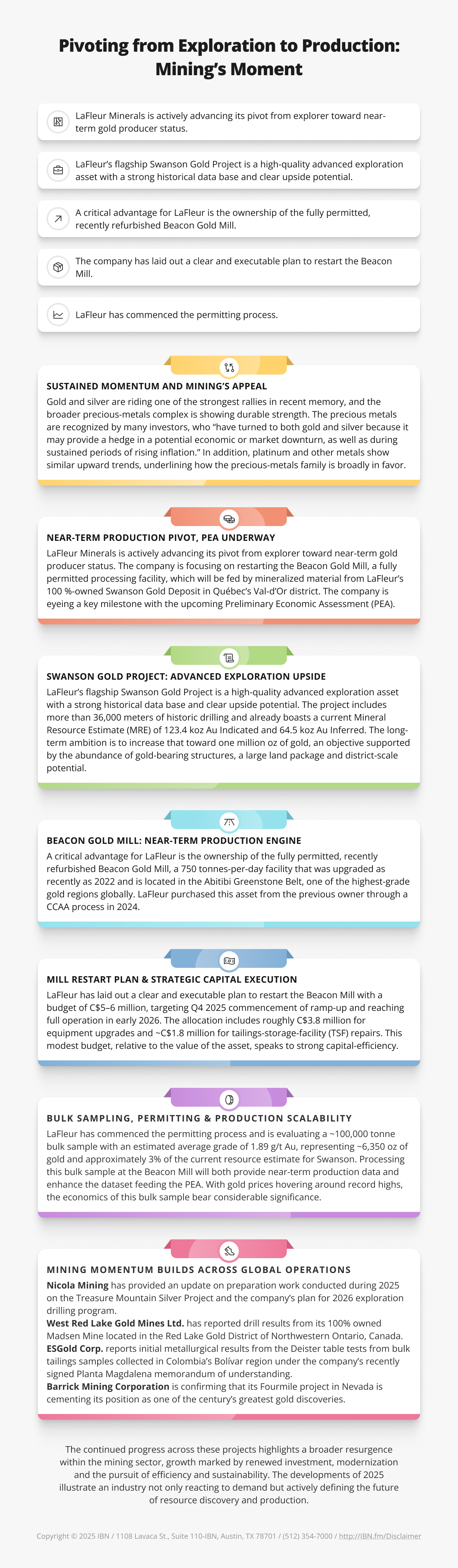 The upswing in precious metals is real, and the mining sector has re-emerged as one of the most compelling investment categories. In that environment, companies that bridge the gap between exploration and production, and especially those that already control processing assets, offer unique opportunities. LaFleur Minerals encapsulates that profile: deep exploration upside, an owned mill in a premium jurisdiction and an imminent production pivot.