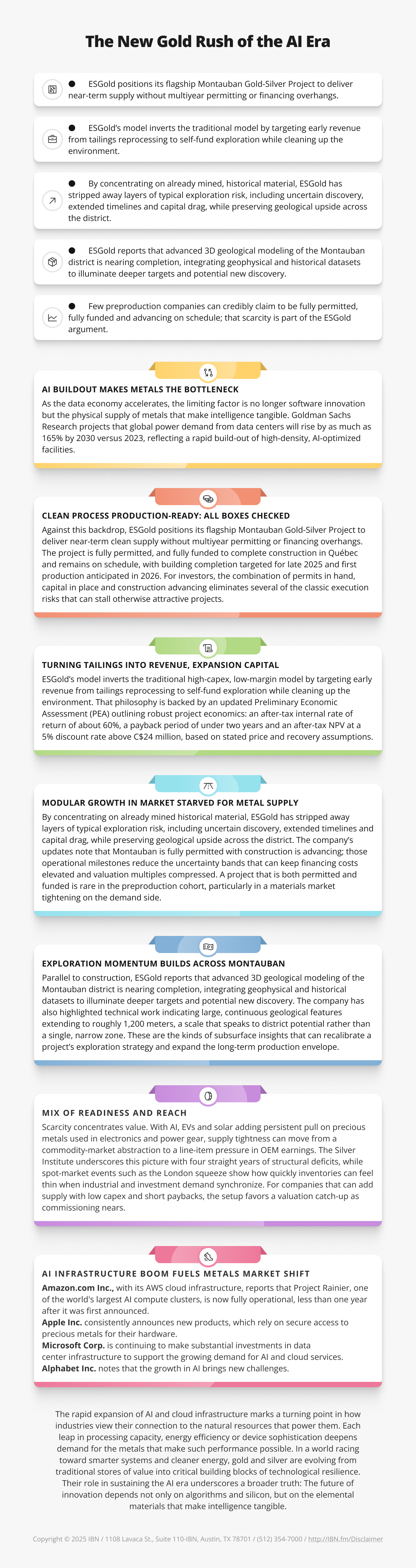 NetworkNewsWire Editorial Coverage: Artificial intelligence (“AI”) runs on gold and silver, the same metals found in every chip, data center, and iPhone, yet global reserves and refining capacity are tightening faster than demand models can adjust. Silver is the irreplaceable conductor woven through photovoltaic cells and high-speed interconnects, while gold remains the corrosion-proof standard in connectors, bonding wire and high-reliability electronics. In 2024, technology demand for gold climbed to roughly 326 tonnes, up 7% year over year, which equates to about 10.5 million ounces consumed by industrial and electronic uses according to the World Gold Council. As that demand base widens with AI hardware scaling globally, ESGold Corp. (CSE: ESAU) (OTCQB: ESAUF) (Profile), enters the picture with a plan tailored to serve this deepening pull on gold and silver through a fully funded, fully permitted project designed for near-term cash flow and longer-term growth. The company joins an impressive group of both producer and user companies, including Amazon.com Inc. (NASDAQ: AMZN), Apple Inc. (NASDAQ: AAPL), Microsoft Corp. (NASDAQ: MSFT) and Alphabet Inc. (NASDAQ: GOOG), that are playing key roles in the global chain that transforms mined metals into indispensable materials for modern technology and electrification.